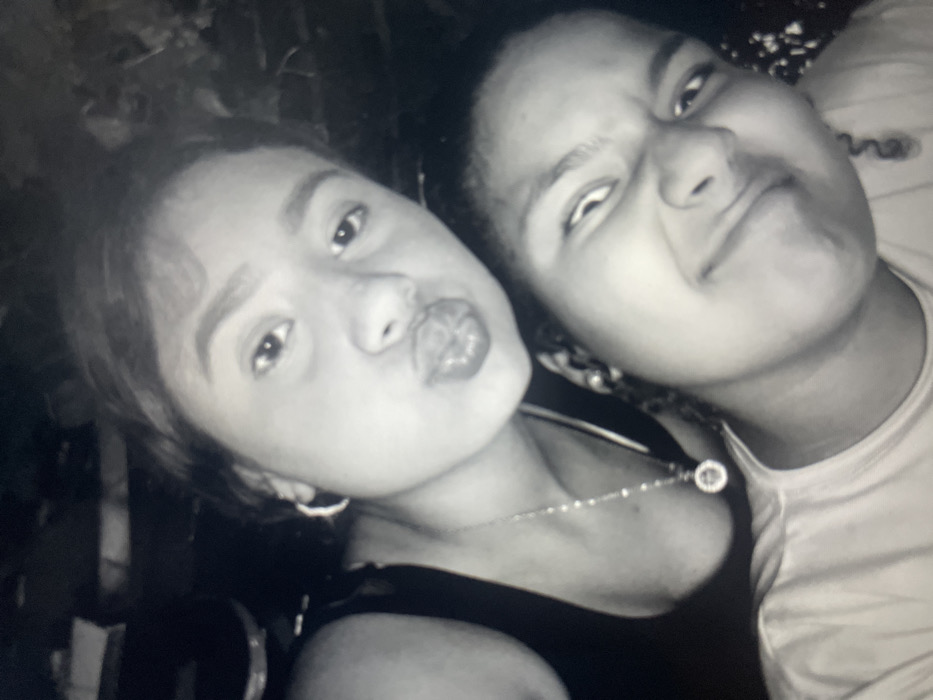 A black and white, close-up photograph depicts two individuals, appearing to be young females, in a selfie format