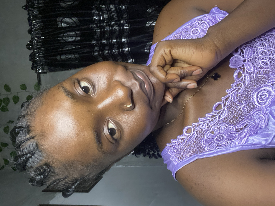 A woman with dark skin looks at the camera. She wears a purple top with lace detailing. Her hair is styled in small braids. A gold necklace with a clover pendant hangs on her chest. A nose ring adorns her nostril. The background features a curtain with a geometric pattern and green leaves. Her hand is placed near her face in a thoughtful gesture.