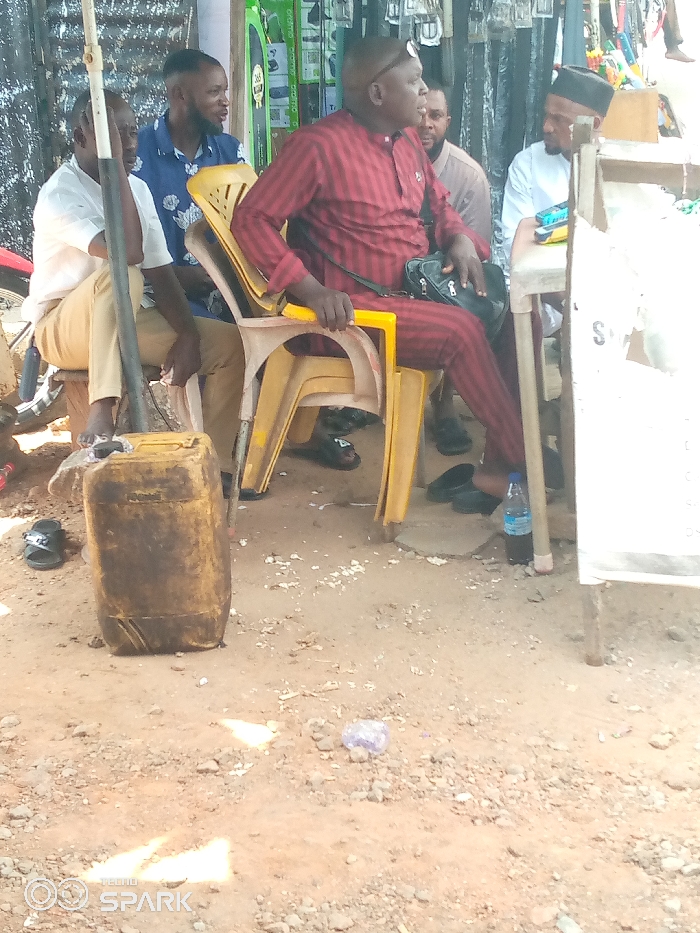 The scene depicts an outdoor gathering of five adult males in Lokoja, Nigeria, situated on a dusty, reddish-brown ground surface. Overhead, a corrugated metal structure provides shade. A prominent figure, a male in a red striped traditional outfit (kaftan-style shirt and trousers), is seated on a yellow plastic chair. He wears glasses and has a black shoulder bag resting on his lap. To his left, another male in a white short-sleeved shirt and tan trousers is seated on a wooden bench, holding a vertical metal pole with his right hand. A dirty yellow plastic jerrycan rests upright on the ground near his feet. Further left, a male in a blue patterned shirt is partially visible, seated behind the man in red. To the right of the man in red, another male, partially obscured, wears a light brown traditional outfit. A fifth male, wearing a white outfit and a black cap (kufi), is seated at a small wooden table to the far right, partially obscured by a white sheet hanging from the table. Multiple yellow plastic chairs are stacked near the seated man in red. A plastic water bottle stands on the ground near his right foot. Various sandals and slippers are scattered on the ground. A small purple object lies on the ground in the foreground. In the background, a storefront displays various consumer goods, possibly electronics or accessories, on shelves. The overall environment suggests a casual, commercial area.