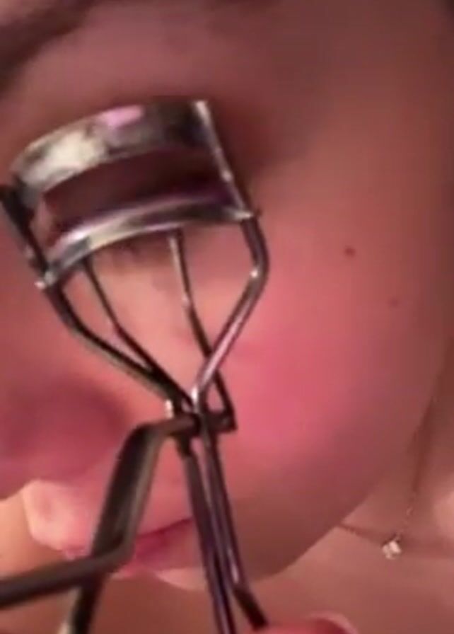 A close-up shot shows a person using an eyelash curler on their upper eyelashes of their left eye