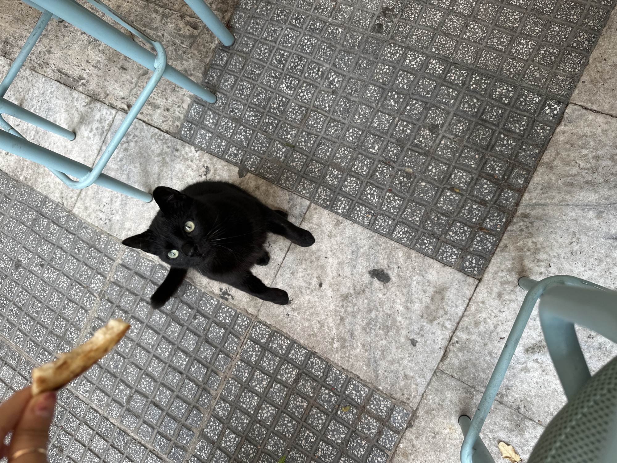 A black cat sits on a patterned gray concrete surface, likely a sidewalk, near the legs of blue metal chairs. A person's hand is visible in the lower left corner, holding a piece of food, possibly a fried potato. The scene appears to be outdoors, possibly a café or restaurant patio. The location is Serres, Greece, based on prior context.