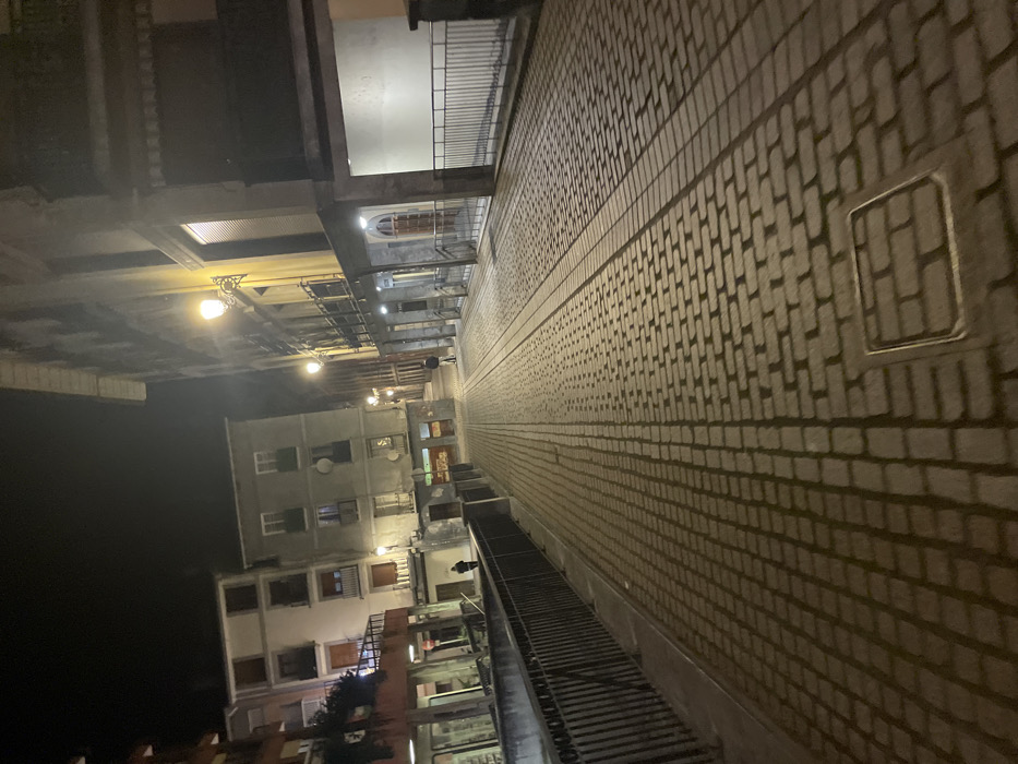 A nighttime urban scene features a narrow cobblestone street illuminated by dim streetlights. Buildings line one side, with windows and architectural details visible. A metal grate runs along the street's edge. The perspective creates a strong vanishing point, drawing the eye into the distance. The angle of the photograph is odd, adding to the feeling that the street is winding and narrow.
