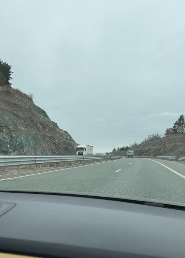 A car is driving down a highway on an overcast day. The road is surrounded by rocky cliffs on either side. There are a few trucks in the distance ahead. The car's dashboard is visible, and it is a light brown or tan color. The sky is grey and cloudy.