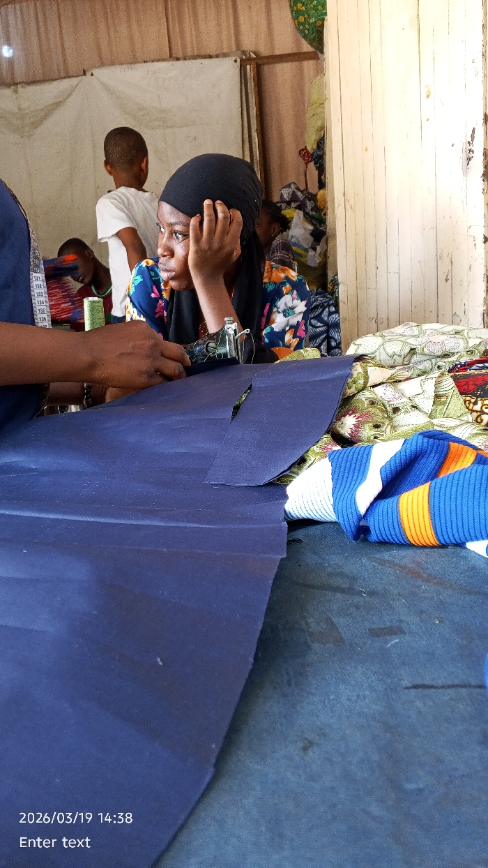 This image depicts an indoor tailoring workshop in Gama, Nigeria, at approximately 14:38 on March 19, 2026