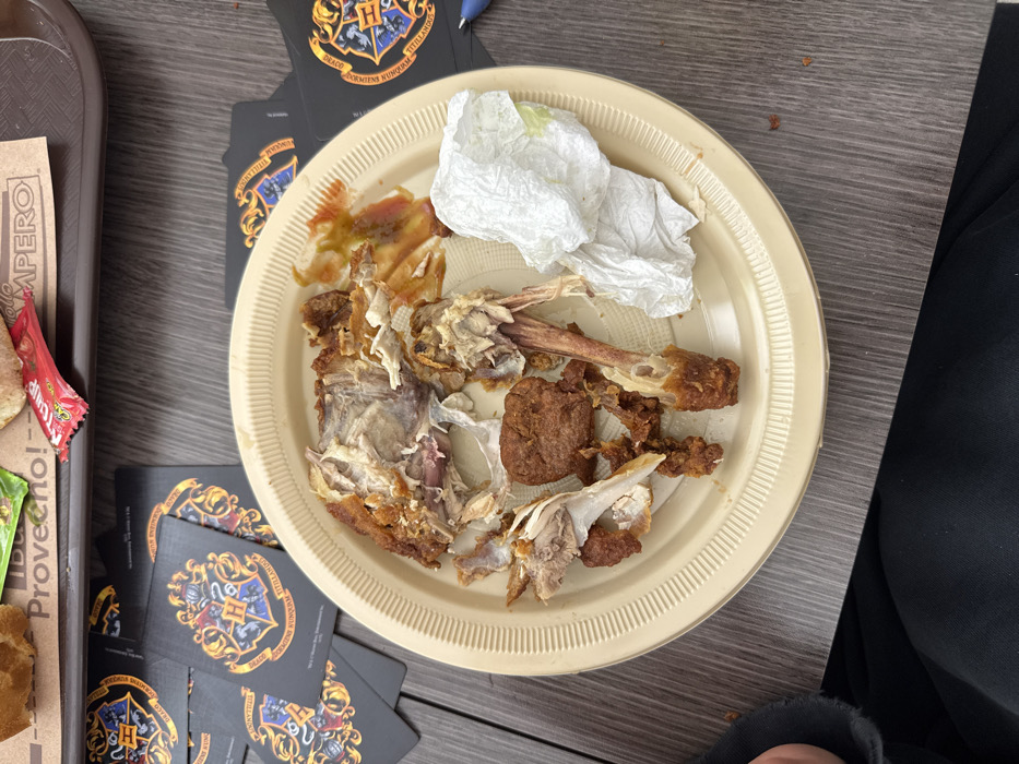 A beige plate holds the remnants of a meal, including picked-clean chicken bones, a small piece of meat, sauce, and a crumpled white napkin. The plate sits on a grey surface with stacked black cards featuring a coat of arms. Part of a tray with food wrappers and a ketchup packet is visible to the left, alongside the edge of a person’s black clothing on the right.