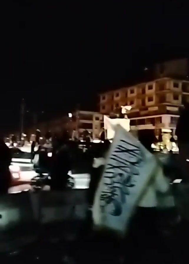 night scene at what appears to be a road junction. There are people, some holding flags, gathered near a concrete barrier. Several vehicles, including cars and a van, are visible in the background with their headlights on. One person is wearing a high-visibility vest. A street light illuminates the scene, and a multistory building is visible in the distance. The general atmosphere seems to be one of a demonstration or gathering at night.