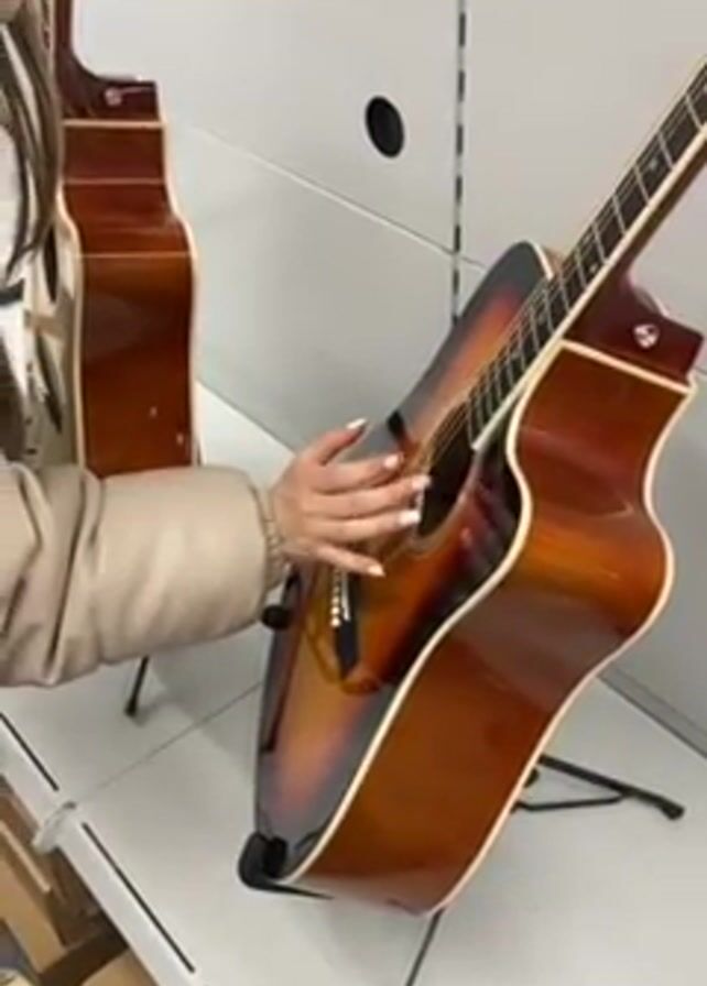 A person stands in a brightly lit store, next to a white shelf. The person is wearing a light beige jacket and has long brown hair. They are standing in front of two acoustic guitars on stands. The guitar nearest the camera is a glossy sunburst color. The person is plucking the strings of the guitar near the soundhole.