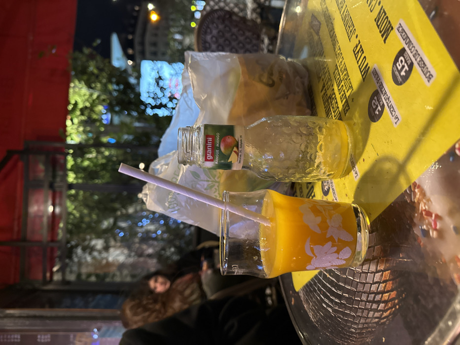 glass of orange juice with a straw and an empty bottle labeled "Granini, Mangue-Mango" resting on a yellow table. Text on the table mentions "Le CENTQUATRE-PAKIS, 12 Mars" and "BOURSE DE COMMERCE, 15 Mars." The table has a mosaic pattern. In the background, there are blurred lights and foliage, suggesting an outdoor setting at night. A person with dark hair is visible at the bottom of the frame.