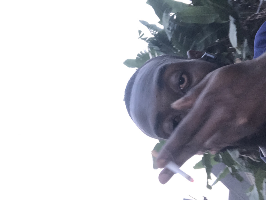 A dark-skinned person is angled toward the camera, holding a lit cigarette. The individual's face, including an eye and hand, are in focus. Green foliage forms a backdrop behind the person. A bright, expansive white space surrounds the subject. The photograph captures a casual, somewhat confrontational pose.