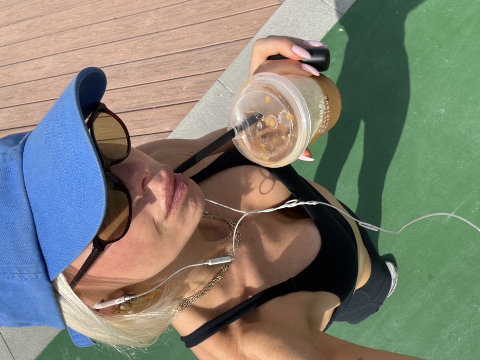 The image depicts a fair-skinned individual in Dubai, United Arab Emirates, captured from an elevated, slightly overhead perspective, likely a selfie. The person has blonde hair, wears a bright blue baseball cap, dark brown oval sunglasses, and white wired earphones. Multiple gold-colored chain necklaces are visible around their neck, resting on a black athletic sports bra. Their right hand, adorned with manicured pink nails, holds a clear plastic cup containing a layered iced beverage with a black straw. The beverage appears to be light brown and green, possibly an iced coffee or matcha latte. Part of a black athletic bottom is visible, along with a white sneaker. The individual's lips are slightly pursed towards the straw. The environment consists of a bright green paved surface in the foreground and to the left, and a light brown wooden planked surface with a grey concrete border to the right, all illuminated by strong sunlight casting distinct shadows.