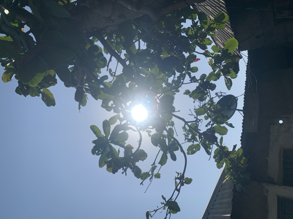 The scene, located in Rido, Nigeria, depicts an outdoor environment on a sunny day, viewed from a low angle. A clear, bright blue sky occupies the upper two-thirds of the frame. The sun, a brilliant white light source, is positioned in the upper center-left, partially obscured by tree branches and leaves, generating a significant lens flare. A large tree with numerous green leaves and branches dominates the upper and right portions of the image; some leaves exhibit minor damage. In the lower half, sections of structures are visible: a corrugated metal roof is present on the left, with a darker building wall below it featuring a recessed rectangular opening. Another corrugated metal roof is partially visible on the far right. A small, black satellite dish is affixed to a mount, positioned below the tree canopy and above the left corrugated roof. No individuals, explicit actions, or interactions are present. The strong lighting indicates daytime conditions.