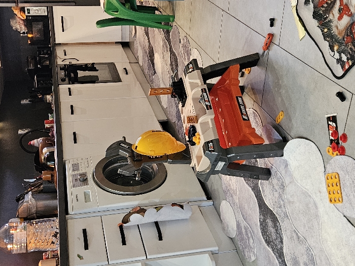 This image depicts an indoor domestic scene, specifically a kitchen or utility area, located in the city of Voden, Bulgaria. The environment features a row of white base cabinets with dark, horizontal handles and a dark countertop spanning the length of the wall. A white front-loading washing machine, labeled "SAMSUNG," is integrated into the cabinetry on the left. To its right, an oven with a glass door is also integrated. Various kitchen items are present on the countertop, including a large clear plastic water bottle, metallic canisters containing utensils, a coffee maker, and a microwave oven. The walls above the countertop are dark. In the foreground and midground, a child's grey and orange toy workbench is positioned centrally on a grey tiled floor. A yellow toy hard hat is suspended from a stand on the workbench. Several small, colorful toy parts, including yellow rectangular pieces, red circular pieces, and black cylindrical pieces, are scattered on the floor around the workbench, suggesting recent use. A toy screwdriver with an orange handle lies near the workbench. The floor is partially covered by two rugs: a larger, abstract grey and white patterned rug, and a smaller rectangular mat featuring what appears to be a festive, possibly Christmas-themed, design in the lower right corner. The legs of a green plastic chair are visible on the far right. A white cloth or towel with a brown, cartoon-like design hangs from a cabinet handle on the far left. No individuals are present in the scene.