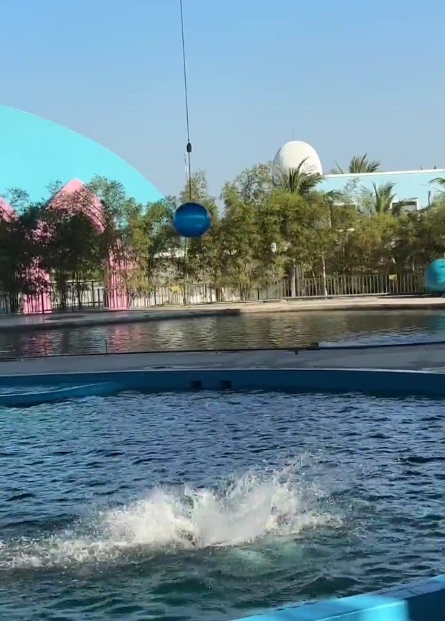The video depicts a dolphin performing a trick in a pool at what appears to be a marine park or aquarium. The dolphin leaps out of the water, seemingly aiming for a suspended blue ball hanging from above. The dolphin is dark in color with a lighter underside. The pool is surrounded by a turquoise border. In the background, there is a pond-like body of water, trees, a fence, and colorful building structures, including one with a rounded white dome. The sky is clear and blue, suggesting a sunny day. The camera follows the dolphin’s jump.