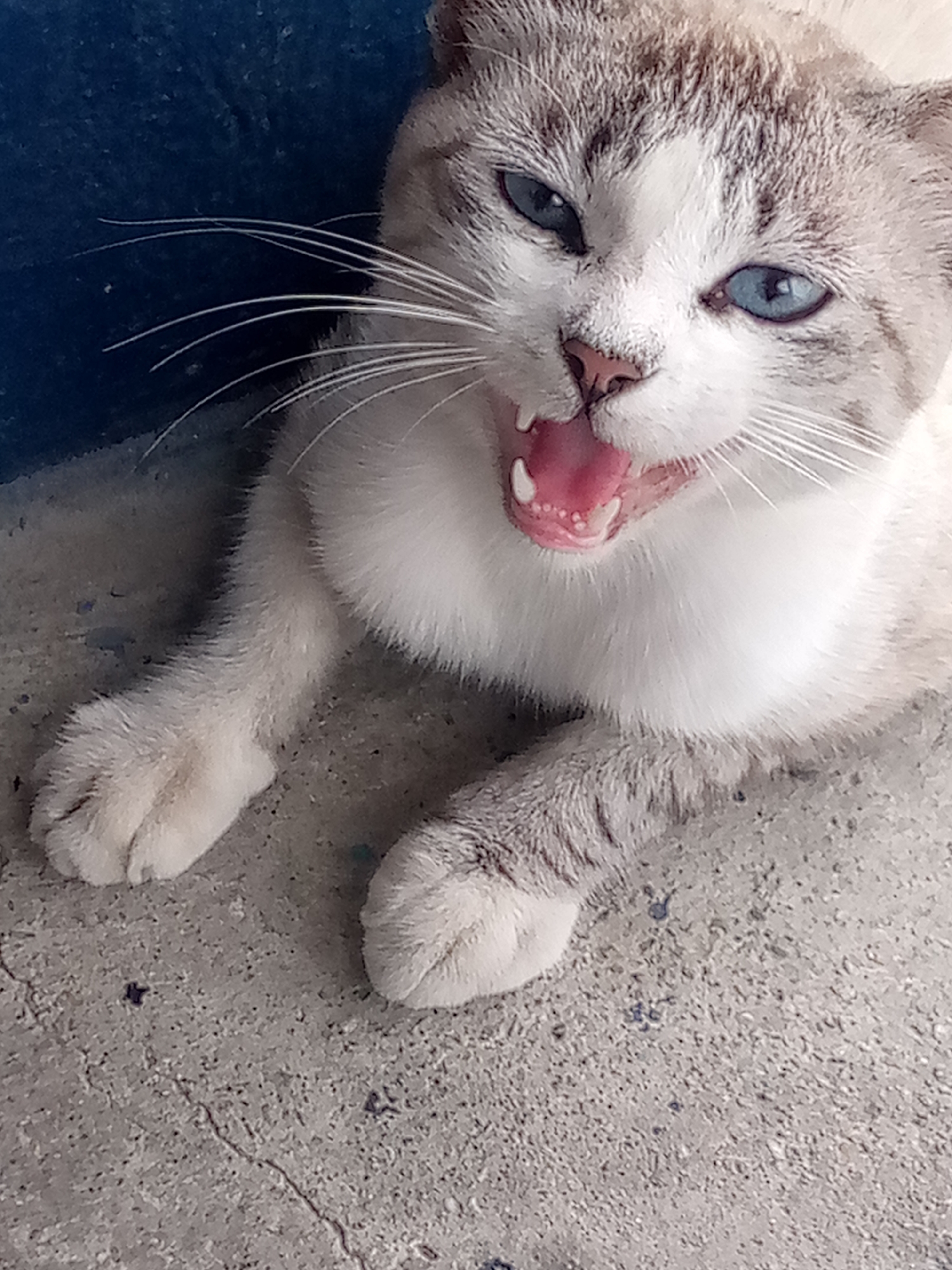 A light-colored cat with blue eyes is lying on a grey concrete surface with small blue and black stains. The cat's mouth is open, revealing pink gums and teeth. The cat is positioned near a blue object that is cut off in the top left corner of the image. There is no mention of a location in El Dátil, Venezuela.
