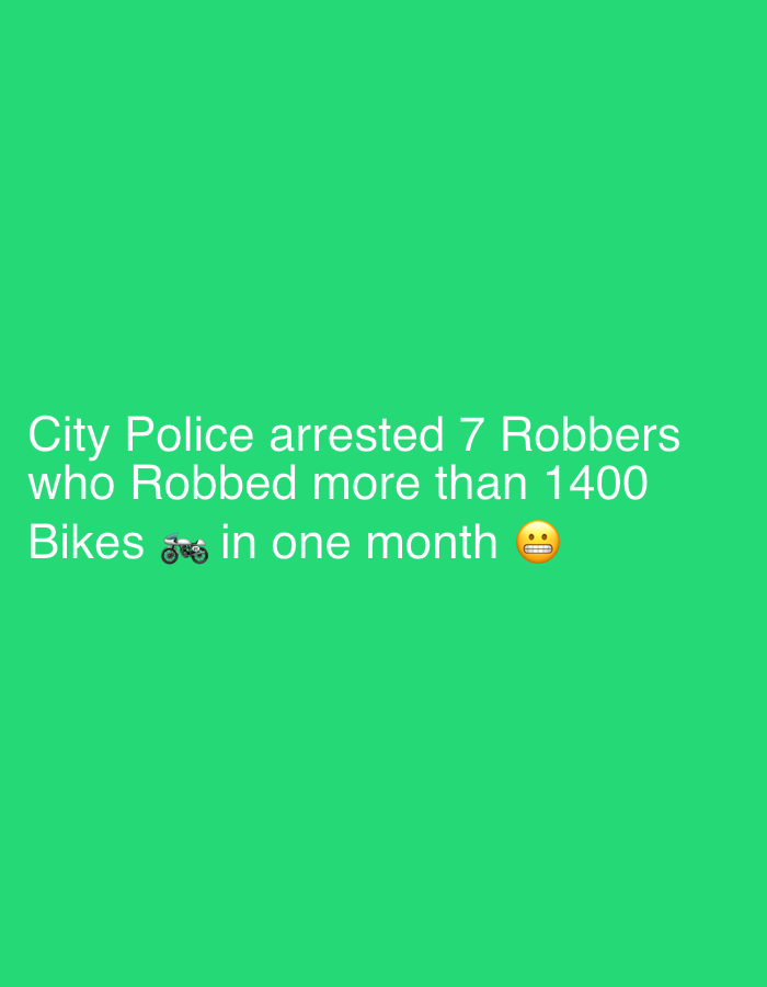 This image displays a digital graphic with a solid, vibrant green background. White, sans-serif text is centrally positioned in the lower portion of the frame. The text reads: "City Police arrested 7 Robbers who Robbed more than 1400 Bikes 🏍️ in one month 😮". A gray motorcycle emoji (🏍️) is present immediately after the word "Bikes", and a yellow surprised face emoji with an open mouth (😮) concludes the sentence. This digital communication pertains to law enforcement activity within Quetta City Tehsil, Pakistan, reporting the arrest of seven individuals involved in the theft of over 1400 motorcycles within a one-month period.