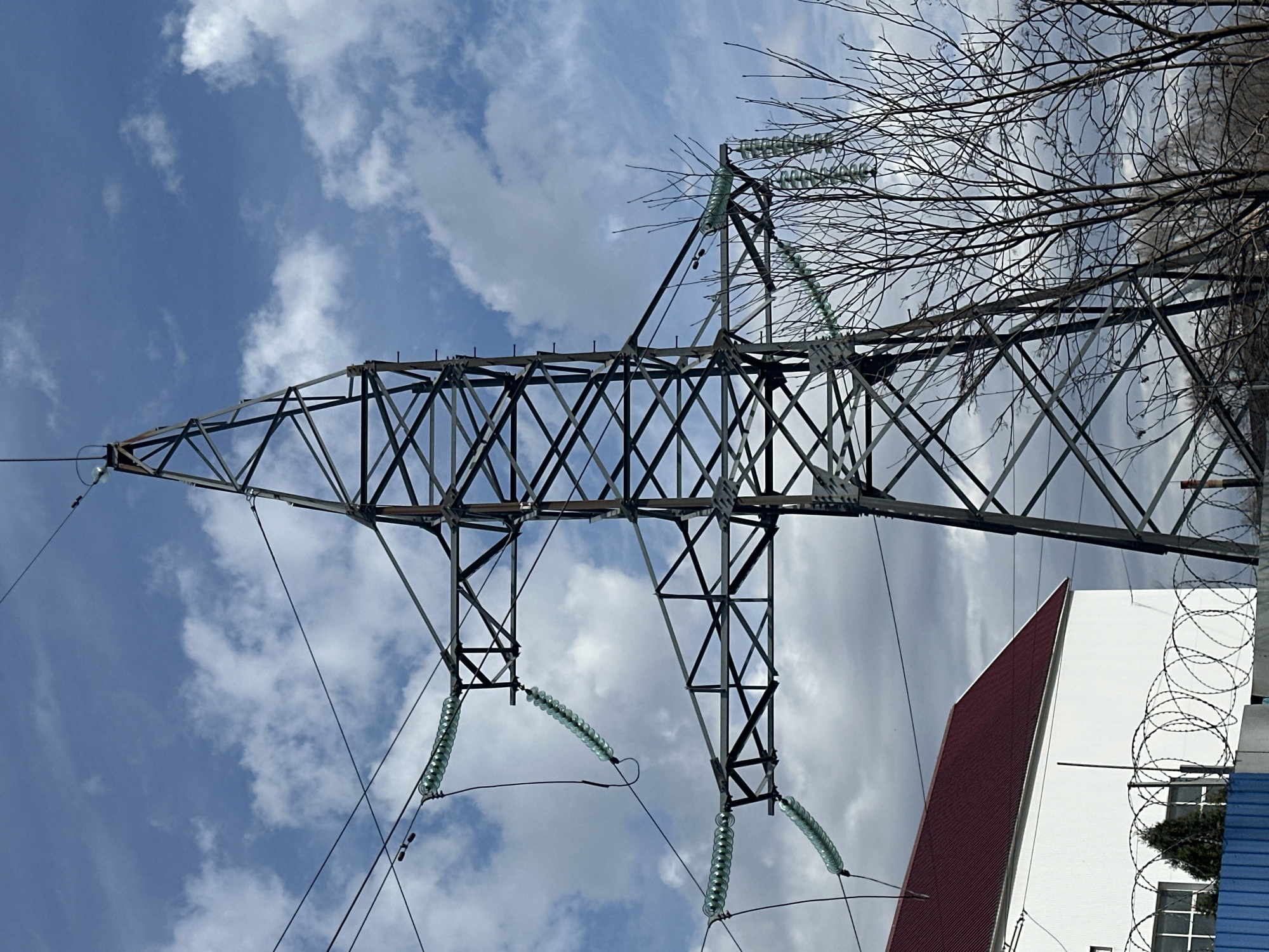 The image depicts a high-voltage power line support structure against a sky with scattered clouds