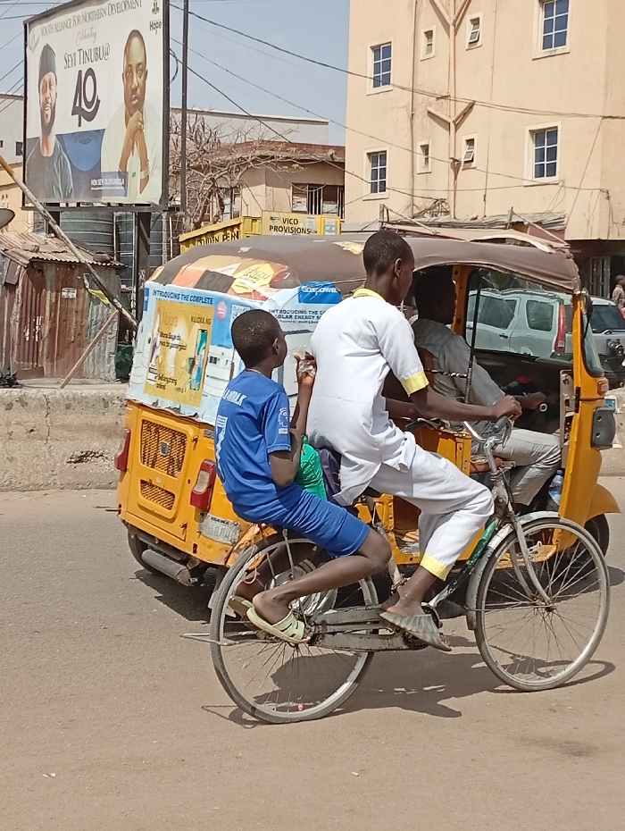 The scene, located in Sabon Gari West, Nigeria, displays an urban street environment under bright daylight