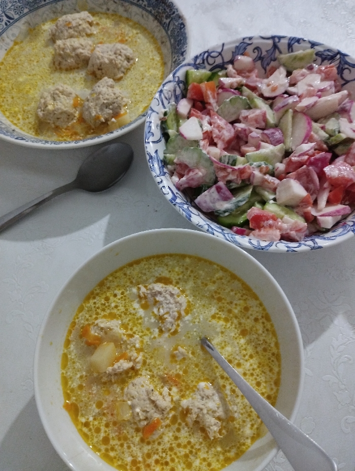 two bowls of soup with meatballs, possibly chicken or turkey, and another bowl containing a mixed salad. The salad contains cucumbers, radishes, and tomatoes. The soups have a creamy, yellow broth with visible oil droplets. Spoons are present in the lower bowl of soup and next to the upper soup bowl. The bowls have white and blue patterns.