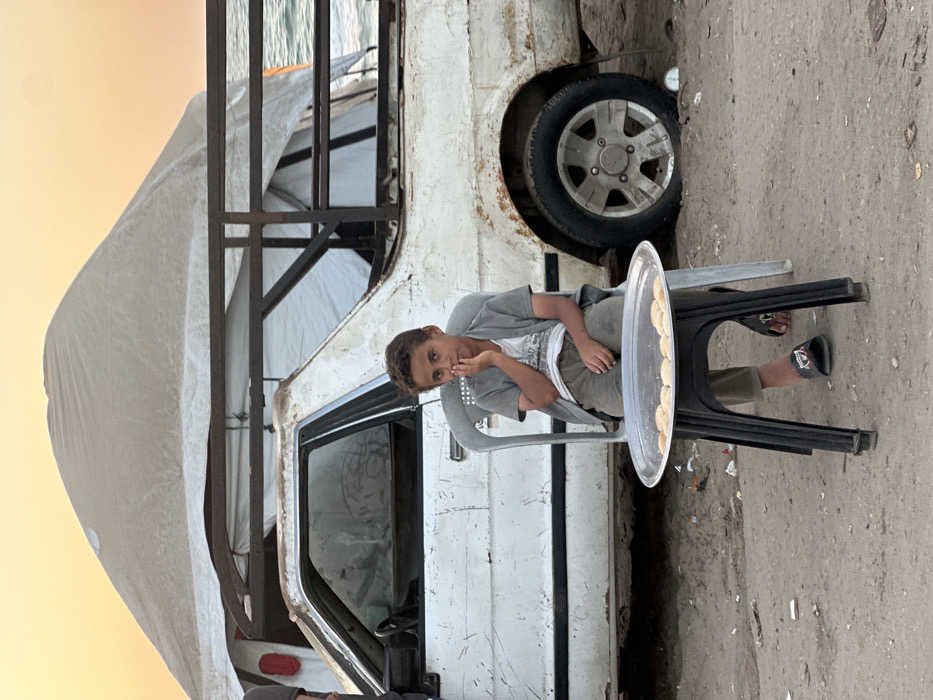 - "A young boy with dark curly hair, wearing a grey t-shirt, a light open cardigan, and olive green trousers, sits on a light grey plastic chair on a dirt ground in Al-Mawasi" by FM-PSI0J3, licensed under CC BY 4.0