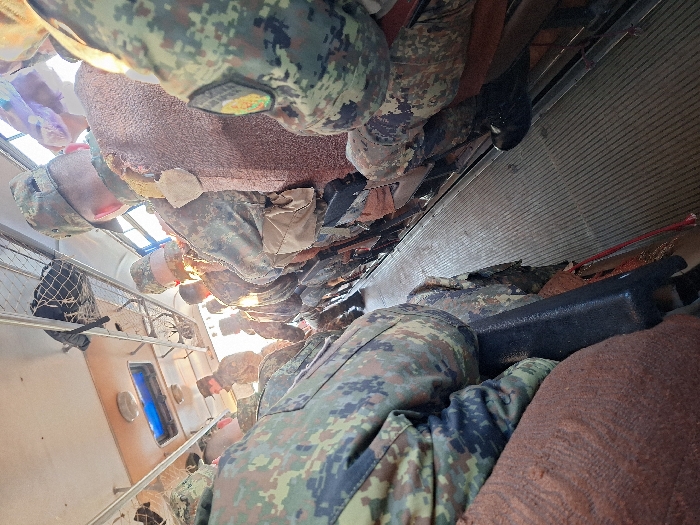 The image depicts the interior of a public transport vehicle, likely a trolleybus or bus, operating within Sofia, Bulgaria. Approximately fifteen individuals are visible, primarily adult males, occupying seats or standing in the aisle. Most subjects are wearing military-style camouflage uniforms with a pixelated green and brown pattern, along with matching patrol caps. One subject in the mid-ground wears a brown, possibly wool, garment over their uniform. A patch featuring an emblem is visible on the right shoulder of a subject in the foreground. Overhead luggage racks, one containing a black bag, are mounted along the ceiling. The vehicle's interior features a ribbed floor, individual seats, and ceiling light fixtures, including a blue-tinted overhead vent or skylight. A black object, resembling a rifle stock or tactical equipment, is visible on the floor between two seats on the left side. The scene is illuminated by strong natural light entering through windows and interior artificial lighting, indicating daytime.