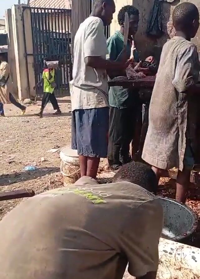 t least four men butchering chickens outside. One man bends over a large tub, sorting through feathers and other debris. Three other men stand at a makeshift table, processing the chickens. The ground is littered with feathers, blood, and other remnants of the butchering process. A fence and buildings are visible in the background. Other people walk along the street in the background.