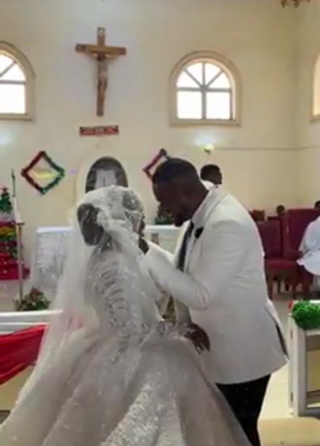 In an indoor setting reminiscent of a church, a wedding is taking place. The environment features cream-colored walls, arched windows, and a prominent crucifix mounted above the altar area. Christmas decorations adorn the space, including small Christmas trees, wreaths, and red ribbons. The focus is on a bride and groom. The bride is wearing an elaborate, long-sleeved white wedding gown with intricate lace detailing and a voluminous skirt. She also has a long veil that partially covers her face. The groom is dressed in a white suit jacket with a black shirt and black pants. The video captures the moment the groom kisses the bride on the forehead. His hands are gently holding her face as he leans in for the kiss. People are visible in the background, including a man dressed in white robes who appears to be a priest or religious figure. Sounds of celebration and cheering can be heard.