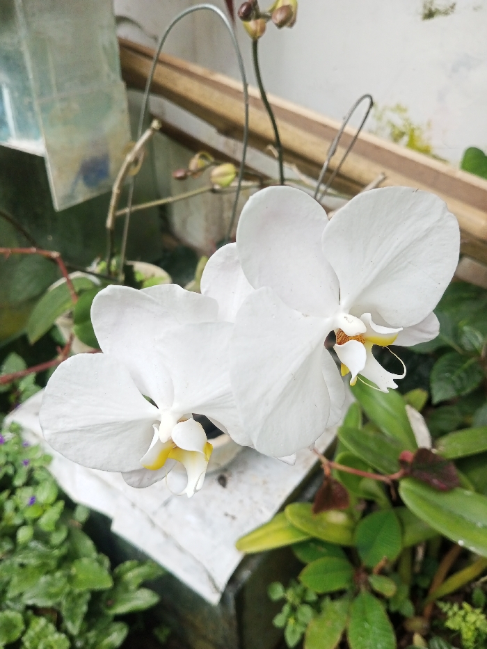 Two white orchids with yellow accents take center stage. The flowers are full bloom, petals smooth with delicate ridges. They sit on a white surface among various green plants with rounded leaves and purple hints. Thin metal rods and wooden slats appear in the background. The scene has soft lighting, highlighting the orchids' pristine white against the lush greenery.