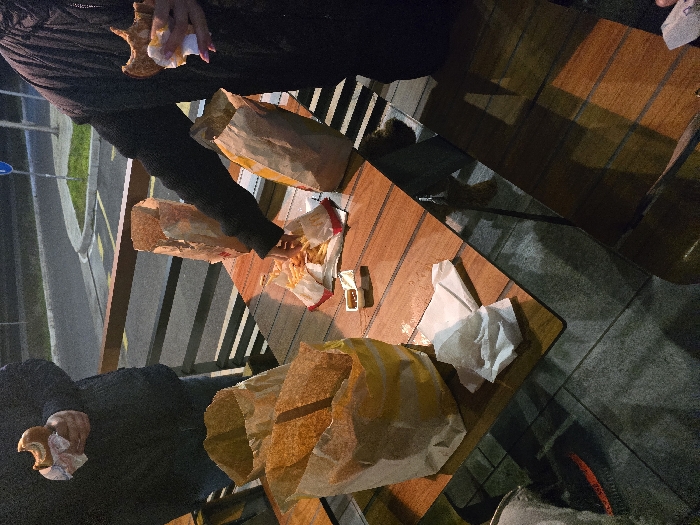 The scene depicts an outdoor dining area at night in Drazhevo, Bulgaria. A rectangular wooden table, illuminated by artificial light, is central. Two individuals are actively engaged in consuming fast food. The person on the left, wearing dark clothing, holds a partially eaten burger wrapped in white paper. The person on the right, dressed in dark attire, holds a partially consumed burger in their right hand and reaches with their left hand into a red and white paper container filled with French fries on the table. The table also holds three full brown paper fast-food bags, one empty brown paper bag, a small white plastic cup containing a light-brown dipping sauce, and multiple crumpled white paper napkins. A dark-furred dog is visible seated under the table on the right. A third person's leg and dark footwear are partially discernible under the table on the far left. In the background, a dark metal railing separates the dining space from a paved street. A white lane marking and a blue circular traffic sign are visible on the street, adjacent to a small patch of green grass. The ground beneath the table is a dark, possibly tiled, surface.