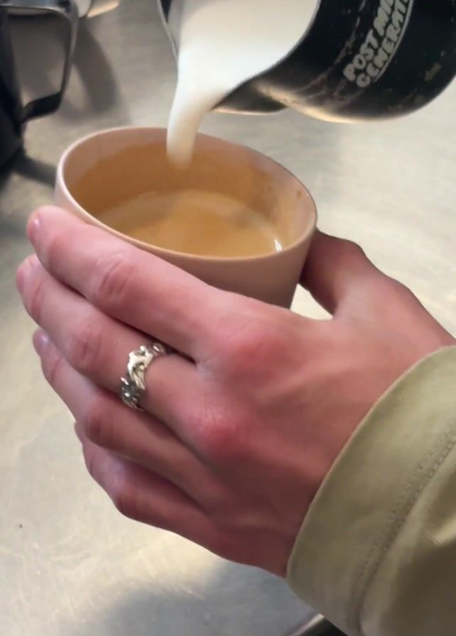 A person wearing a light green shirt and a silver ring on their left ring finger holds a pink cup of coffee. They are pouring a liquid that appears to be milk into the cup from a black pitcher. The liquid mixes with the coffee in a swirling motion, creating a design. The table has a metal surface.