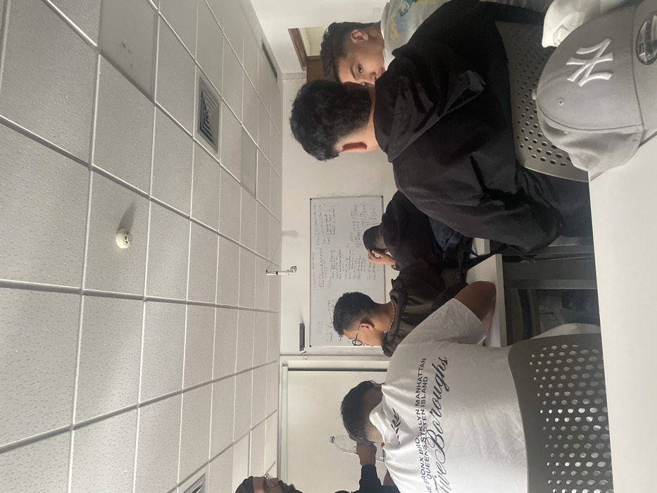 An interior view depicts a classroom or lecture hall in Casablanca, Morocco. Six individuals are visible: one adult male, possibly an instructor, is partially seen on the left, holding a clear plastic water bottle. He wears glasses and has a beard. Five younger males, likely students, are seated at white desks. The student in the immediate foreground wears a white T-shirt with the text "THE BRONX BROOKLYN MANHATTAN QUEENS STATEN ISLAND Five Boroughs" on the back. Another student, positioned to the right of the first, wears a dark hoodie and is seen from behind. Further right, a student wearing glasses and a dark shirt is observed looking towards the right. In the back row, one student has his hands on his head, while another on the far right wears a light-colored top and gazes towards the student in the dark hoodie. A grey New York Yankees baseball cap rests on a desk in the foreground, right. The room features white walls, a white grid ceiling with recessed lighting panels, a smoke detector, and an air vent. A whiteboard at the front of the room contains handwritten text and equations. A light-colored door frame is visible on the far right.