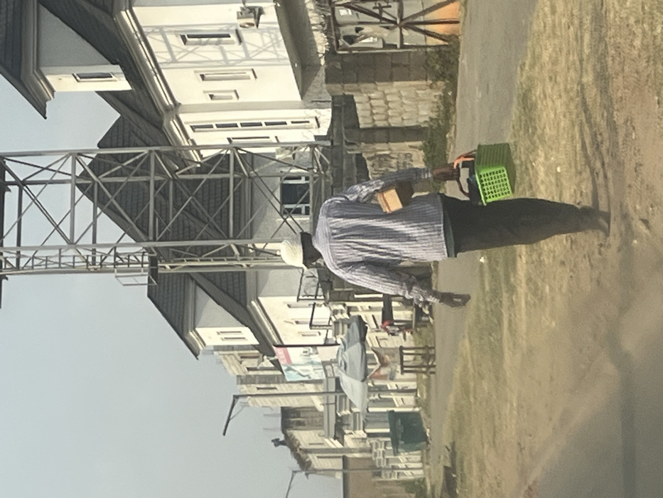 An individual wearing a white cap and a long-sleeved striped shirt carries a small cardboard box and a green plastic basket down a residential street. The houses are white with peaked roofs, and a metal structure spans between some of the buildings. A patch of grass borders the road, and sunlight illuminates the scene.