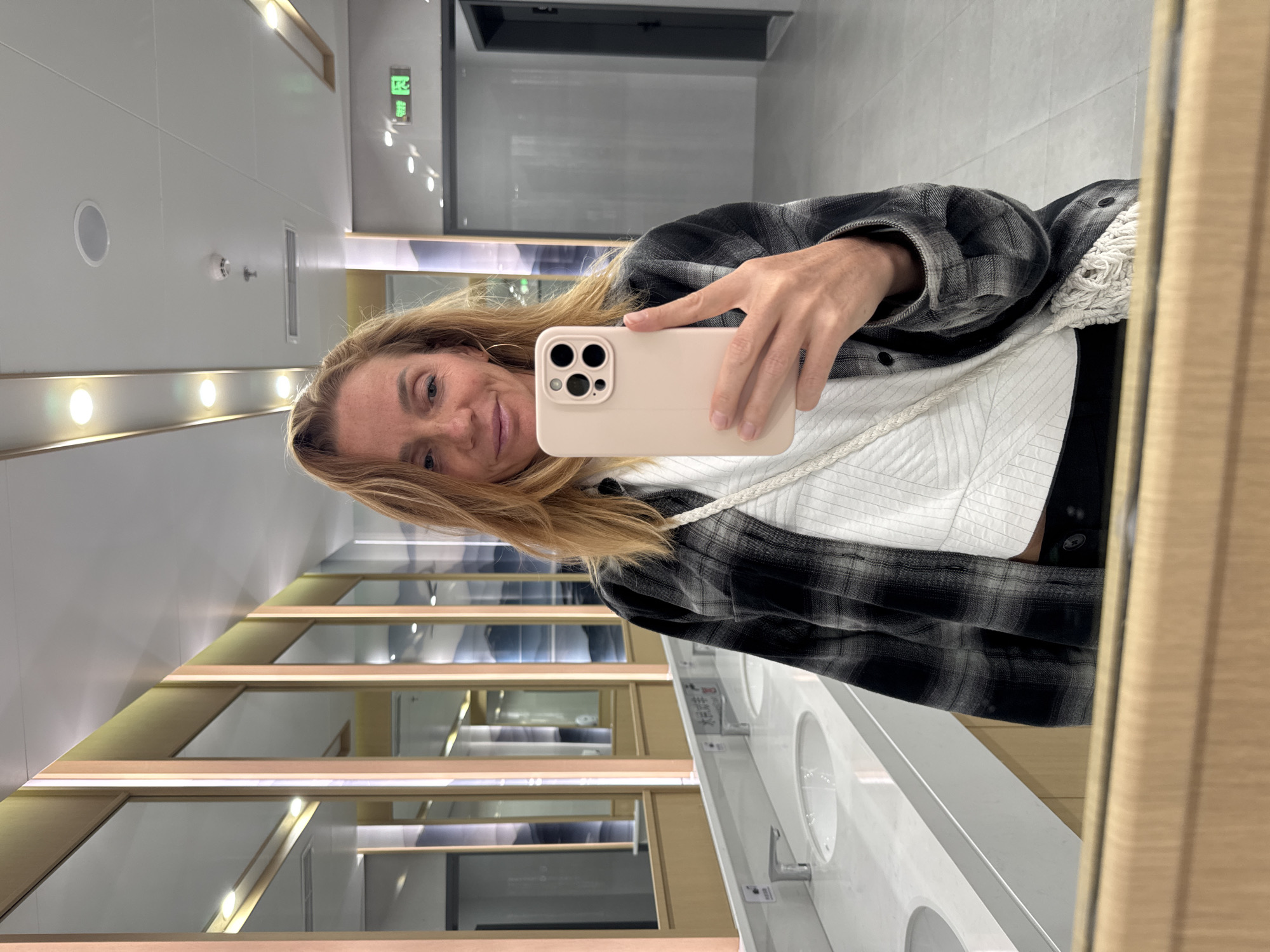 The photograph appears to be a self-portrait taken in a bathroom, likely in a commercial or public space. The subject is a fair-skinned individual with blonde hair, facing the camera and holding a smartphone to take the picture. They are wearing a white shirt under a dark, checkered jacket. Part of a white shoulder bag is visible. The background shows a modern bathroom with white countertops, round sinks, and silver faucets. In the mirror's reflection, there are multiple layers of glass and light fixtures above, hinting at a multi-level structure. A green exit sign is visible. There's no definitive evidence pinpointing the location to Wulong District, China, from visual elements alone. Determining the location would require additional contextual information or metadata associated with the image.