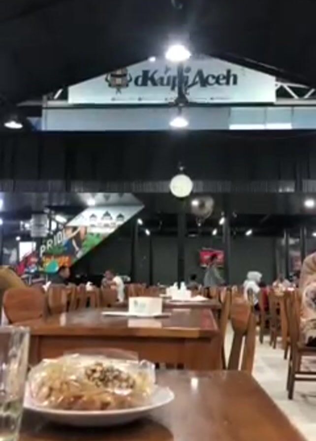 interior of a restaurant called "dKupi Aceh". There are many wooden tables and chairs arranged throughout the space. Some tables are occupied by people, some of whom are wearing headscarves. On the table closest to the camera is a plate of food wrapped in plastic, and a partially empty glass. There are decorations and murals on the wall. The ceiling is black with hanging lights and fans.