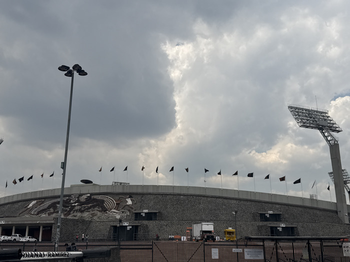 An exterior long shot depicts the Estadio Olímpico Universitario in Ciudad Universitaria, Mexico City, Mexico, under a heavily overcast sky with diffused daylight