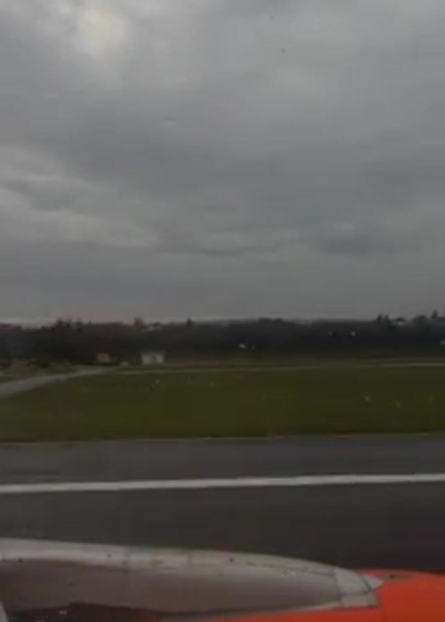 view from inside an airplane, specifically through a window. Outside, it's a cloudy day with light rain. The plane appears to be on a runway, as evidenced by the marked asphalt, adjacent green grass, and distant buildings and trees. Part of the airplane's wing, painted orange, is visible in the foreground. There is slight vibration of the engine that can be seen on the wing as well.
