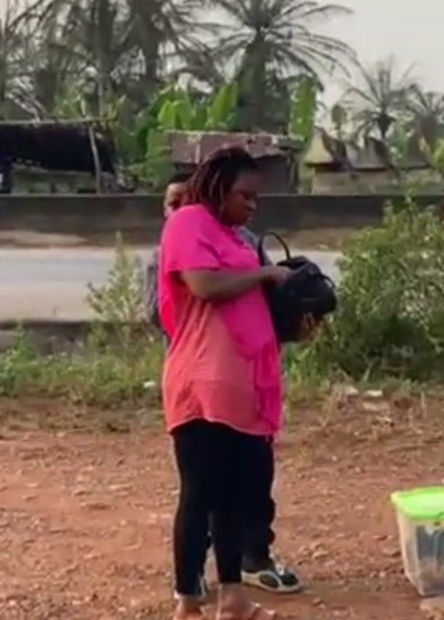 three people on a dirt patch. A woman in a pink top and black leggings is searching in a black bag. Standing behind her is a younger person in a denim shirt. To the right is another person in a patterned outfit. A green container sits on some bricks near them. The scene takes place near a road with sparse vegetation. Palm trees are visible in the background under an overcast sky.
