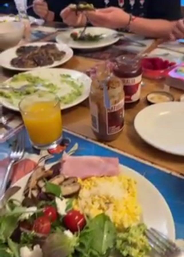 A group of people are eating breakfast around a wooden table. There are six people visible, but only the hands and faces of some. Plates of food are scattered around the table. The meals seem to include salad, avocado toast, scrambled eggs, ham, mushrooms, fruit, and orange juice. There are also jars of jams and yogurt containers on the table. People are eating with forks. The room appears to be a dining area, with a couch and window visible in the background. The atmosphere seems casual and relaxed.