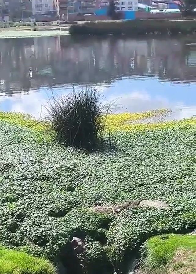 calm lake reflecting the sky and buildings on the opposite shore. The foreground consists of a green, grassy bank leading to the water's edge, which is covered in dense green vegetation. A small stream flows into the lake from under the grass. A small, round bush sits amidst the vegetation. The overall scene conveys a sense of peacefulness.