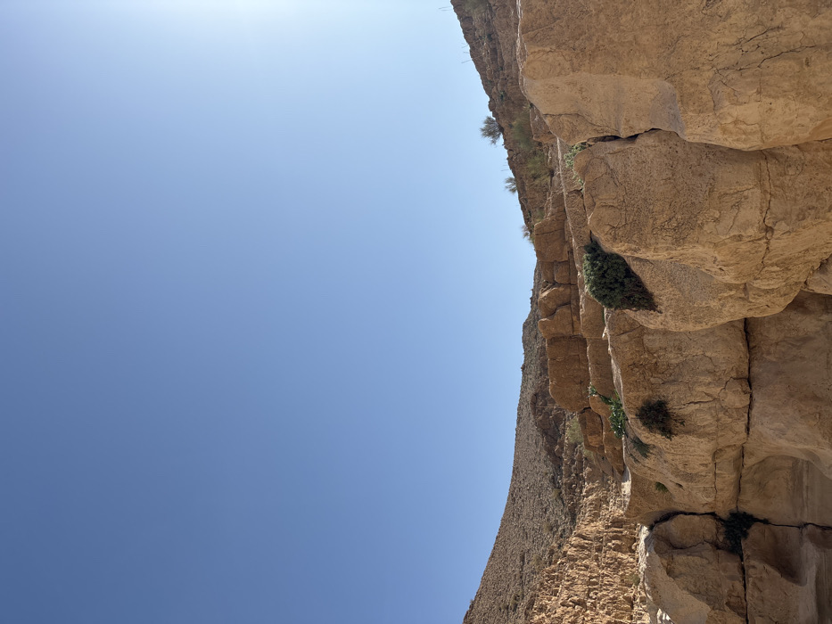 A high-angle shot captures a stark contrast between a clear blue sky and a rugged rock face. The rock, predominantly beige, features deep crevices, small patches of green vegetation clinging to its surface. The weathered texture of the rock suggests age and exposure, with varying layers and erosion patterns visible. The sky occupies a significant portion of the frame, highlighting the height of the cliff.