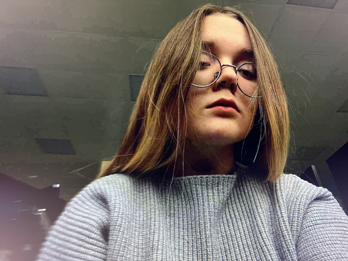 A young woman with shoulder-length blonde hair and round glasses looks directly at the camera. She has a serious expression, and her hair partially obscures her eyes. She wears a grey, knitted sweater. The background is a neutral grey, possibly a ceiling with recessed lighting. The lighting is somewhat dim, giving the image a slightly grainy appearance. A lens flare is visible in the lower left corner of the image.