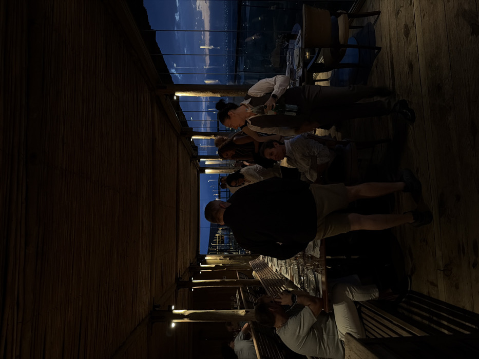 A group of people gather around a long table at a restaurant with a scenic view. A server in a white shirt and vest pours a beverage. Diners are casually dressed, some in collared shirts. The restaurant's decor features wood, with a woven ceiling and wooden floors. It's dusk, with a view of lights from a city across the water.