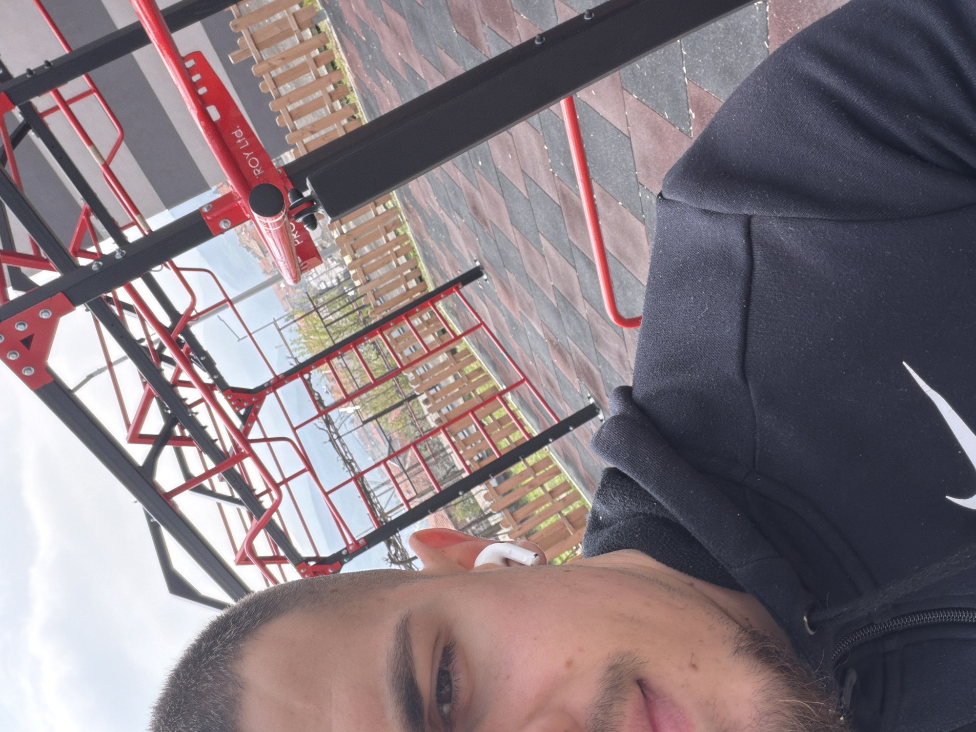 A selfie shows a person with short, dark hair and facial stubble standing in an outdoor fitness area in Peshtera, Bulgaria. They are wearing a black hoodie with a white Nike logo. An AirPod is visible in their ear. The fitness area features red and black metal structures, possibly monkey bars or other exercise equipment, with "ROY Ltd." branding. The ground is covered in multicolored pavers. Beyond the fitness area, there's a glimpse of a residential area with buildings and trees. The sky is overcast.