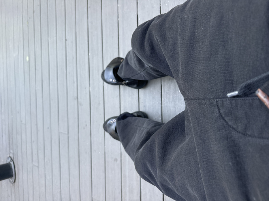 A first-person, eye-level photograph shows the lower torso, legs, and feet of a person situated on a light grey wooden deck in Tremblay-en-France, France. The subject wears dark grey or black sweatpants, exhibiting signs of wear and creasing. The drawstring of the sweatpants is visible at the bottom center, featuring a metallic aglet and a frayed end. Both feet are shod in dark, closed-toe shoes or clogs, each with a glossy metallic silver-colored panel on the toe secured by two small silver-toned rivets or grommets. The footwear rests directly on the wooden deck, which is composed of horizontally laid planks. A dark, cylindrical post with a circular base is partially visible in the upper left background.
