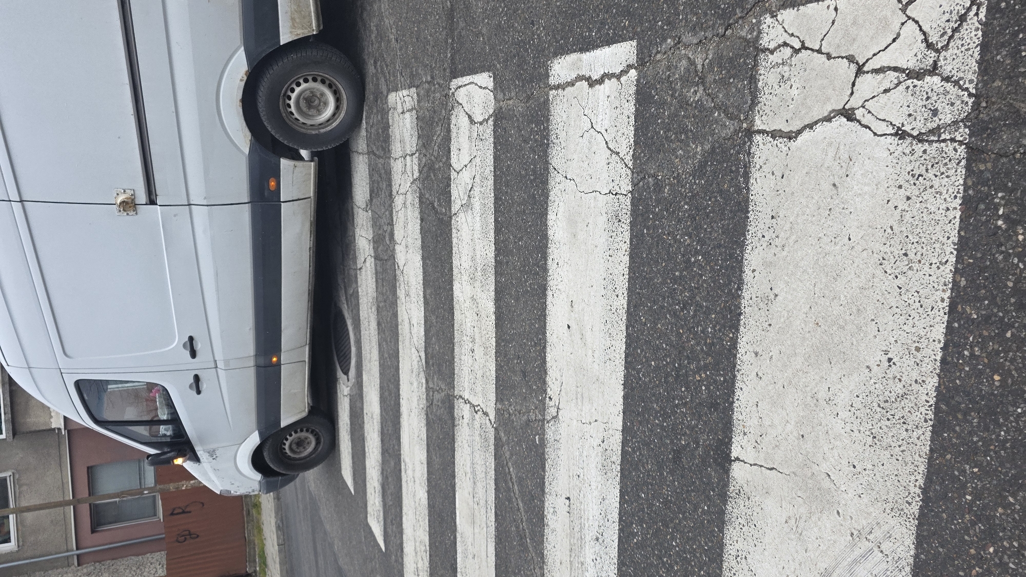 A white van is partially parked on a crosswalk, with the front portion of the vehicle visible