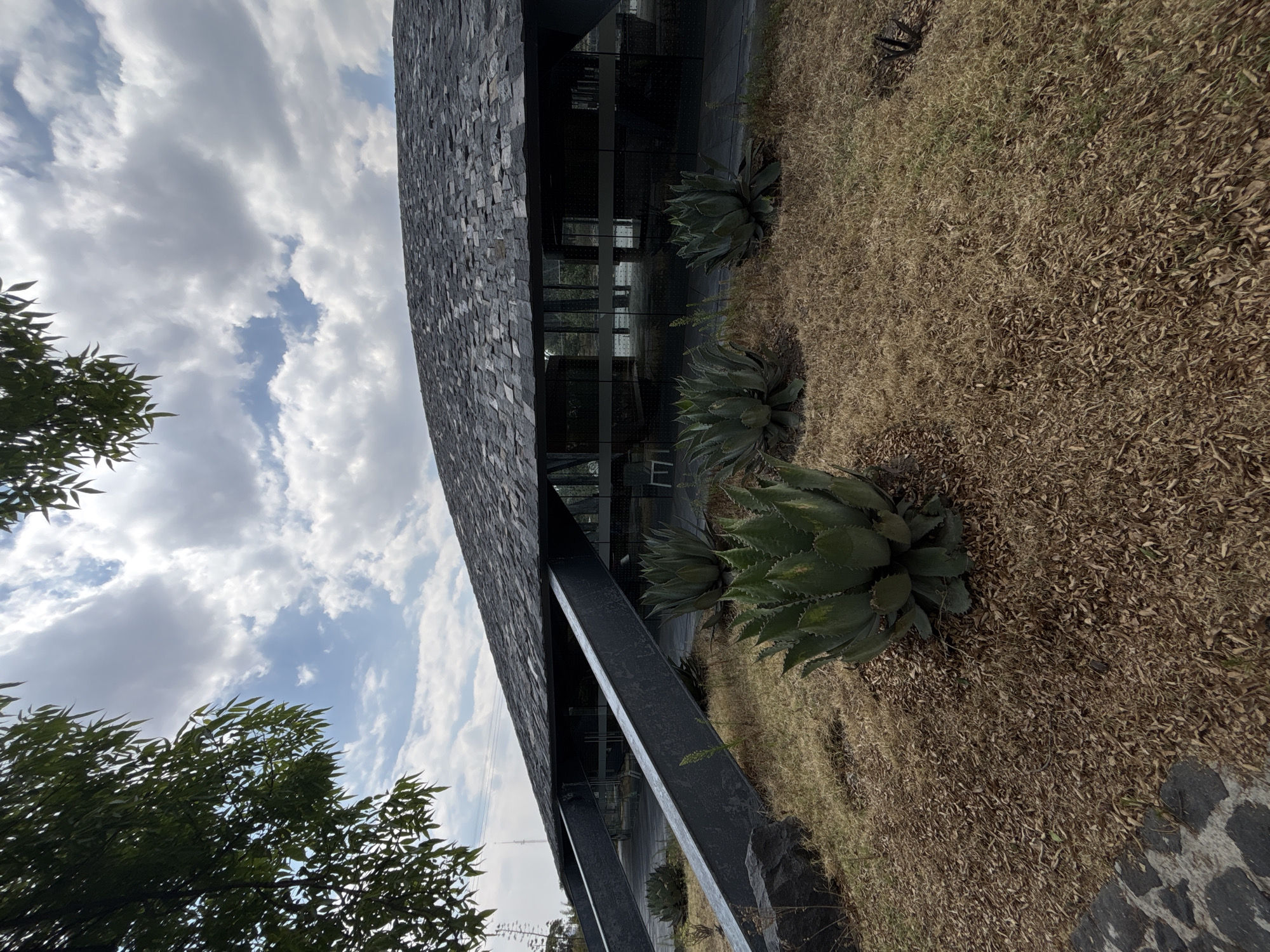 The image displays the exterior of the Fundación Jumex museum, situated in Plaza Carso, Mexico City, Mexico. The scene is observed during daylight hours under a sky with scattered white clouds and patches of blue. The building features a distinctive, large, curving roof clad in numerous dark gray, irregularly shaped stone or slate tiles. Dark gray, angled structural beams extend from the ground, supporting the roof's overhang. The building's facade beneath the roof consists of extensive, reflective dark glass panels, which partially obscure the interior but reveal faint shapes resembling white chairs. The ground in front of the building is covered predominantly with dry, brown grass and scattered brown leaves, with some sparse green vegetation. Several large, spiky agave plants are distributed across this arid landscape. Dark, irregular rocks are visible on the ground, particularly in the lower left, adjacent to a section of dark, patterned stone pavement. Green foliage from a tree occupies the upper left corner of the frame. A slender vertical structure, possibly an antenna or tower, is faintly visible in the far background. No individuals are present in the depicted scene.