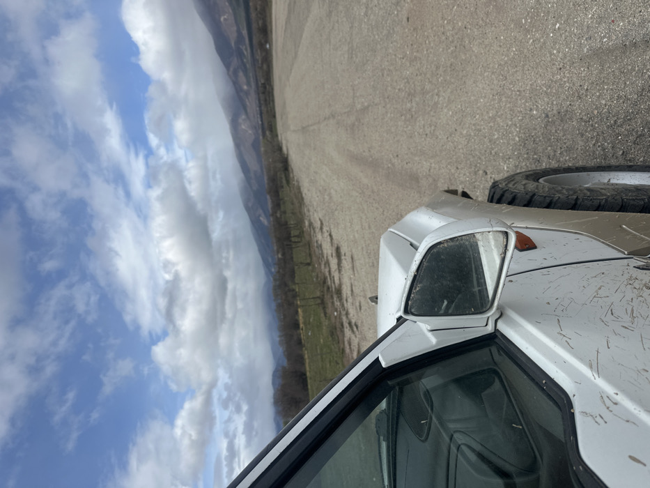 A white, mud-splattered off-road vehicle is stationary on a dirt or gravel road in Moskovets, Bulgaria. The front right quarter of the vehicle is visible, showing the dirty bonnet, a portion of the windshield, the A-pillar, and the exterior side mirror, which is also coated in dirt. A robust off-road tire with a silver rim is positioned at the lower right. The unpaved road extends into the distance on the right side of the frame. To the left of the road, a field of sparse green grass and bare vegetation contains several wooden fence posts. In the background, a range of mountains is partially obscured by low-hanging clouds or fog. The sky above is characterized by patches of blue intermingled with scattered white and gray clouds. No individuals are visible.