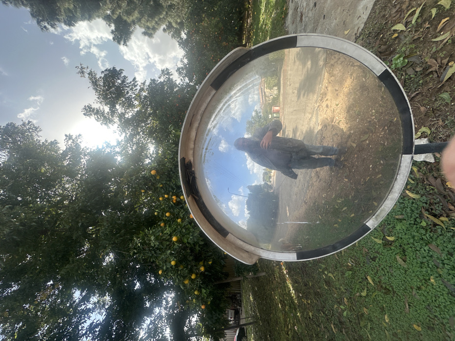 The image displays an outdoor scene in Beit Yitzhak-Sha'ar Hefer, Israel, on a sunny day. A large, circular convex traffic mirror, featuring a white frame with black segments along its rim, is prominently positioned in the lower-central portion of the frame. The mirror reflects a bearded male figure, dressed in a dark jacket and blue jeans, standing on a dirt road with his right hand positioned near his chest. A small, light-brown dog is also visible in the reflection to the man's left. The reflection further captures a street, a utility pole, distant trees, and a partly cloudy blue sky. Above and to the left of the mirror, the surrounding environment consists of a large tree with dense green foliage bearing numerous ripe yellow/orange citrus fruits. Additional green trees are visible in the background against a blue sky with scattered white clouds, with sunlight strongly illuminating the upper right. The ground immediately surrounding the mirror's base features green vegetation intermixed with scattered dry leaves and a patch of concrete to the right. A human finger or thumb is partially visible at the very bottom center of the image.