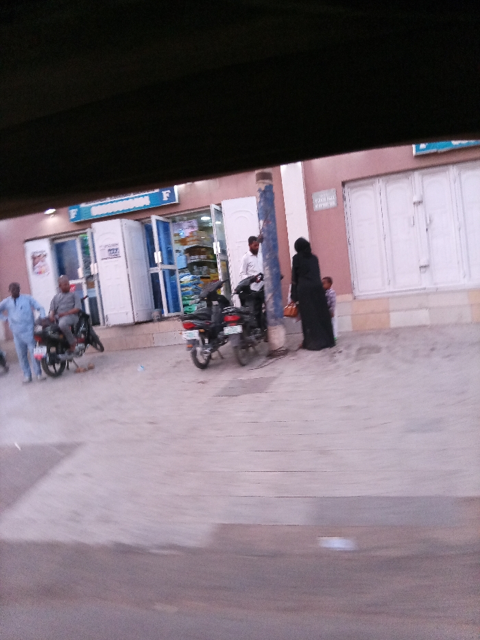 A street scene shows a storefront with the letter "F" on its awning. Several people are visible, including a woman in a black hijab standing near a child. Men are near two motorcycles. The street is lined with buildings, one having closed white doors. The view is partially obstructed by an object in the foreground.