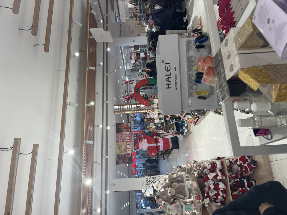 A brightly lit retail store displays holiday merchandise. A large inflatable Santa stands near shelves filled with Santa plush toys. Above, hanging Santas dangle. A Christmas wreath archway adds to the festive decor. A "HALEI WATERPROOF" display case showcases watches and accessories. Aisles stretch back into the store, lined with products under fluorescent lighting. Wooden accents and ceiling fixtures add a modern touch to the commercial space.