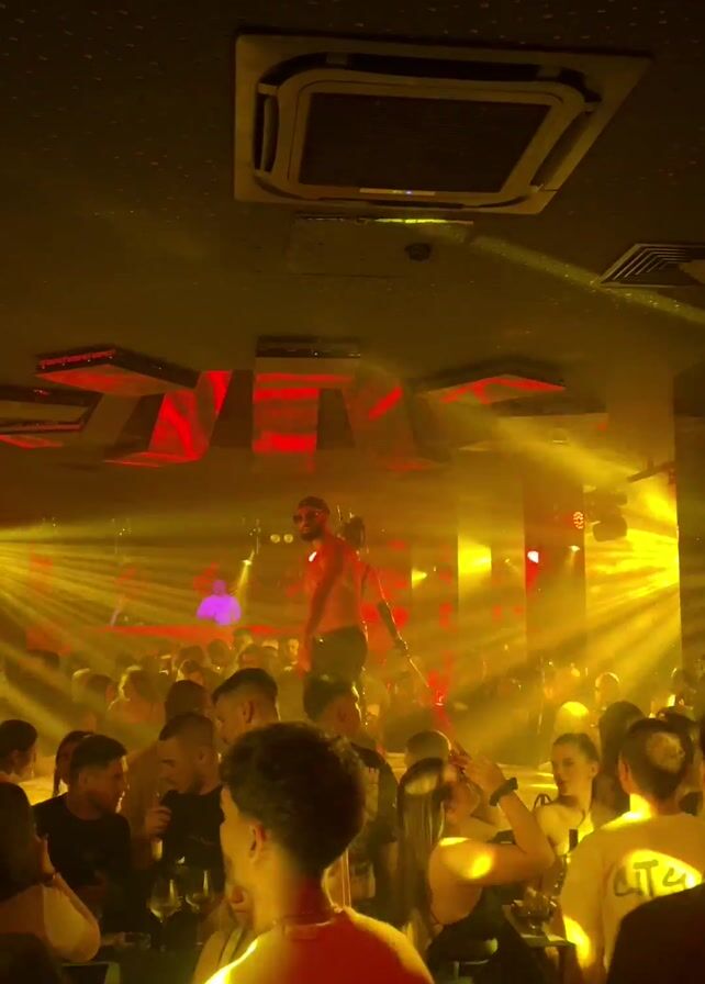 crowded nightclub with red and yellow lighting. A muscular man in a bandana is on a platform, possibly performing or singing, surrounded by people. Many people are standing, dancing, or seated at tables drinking. The club has a modern interior with lighting fixtures and a drop ceiling.